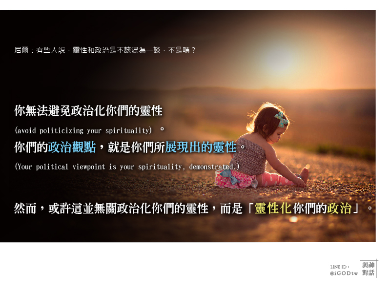 然而,或許這並無關政治化你們的靈性 ,而是「靈性化你們的政治」 。