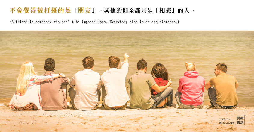 朋友是「不會覺得被打擾」的。其他的則全都只是「相識」的人。 (A friend is somebody who can’t be imposed upon. Everybody else is an acquaintance.)