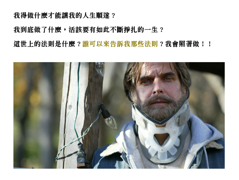 我得做什麼才能讓我的人生順遂?我到底做了什麼,活該要有如此不斷掙扎的一生?這世上的法則是什麼?什麼人可以來告訴我那些法則?我會照著做,但首先必須有人告訴我那些法則。並且在告訴我之後,不要又更改它們!!!