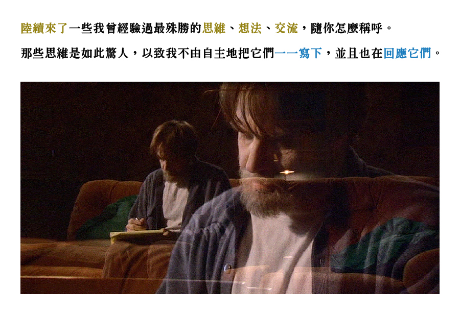 在這之後,就陸續來了一些我曾經驗過最殊勝的思維、想法、交流,隨你怎麼稱呼。那些思維是如此驚人,以致我不由自主地把它們一一寫下,並且也在回應它們。那些給予我(透過我)的想法,答覆了我提出的問題,但它們又再引發其他我前所未有的問題。因此我便在那裡進行了一段「筆和紙之間的對話」