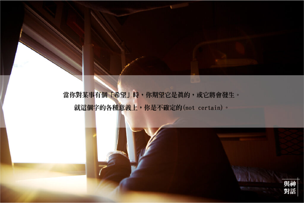 當你對某事有個「希望」時,你期望它是真的,或它將會發生。就這個字的各種意義上,你是不確定的(not certain)。