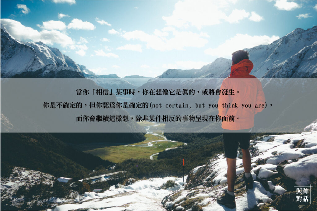 當你「相信」某事時,你在想像它是真的,或將會發生。你是不確定的,但你認為你是確定的(not certain, but you think you are),而你會繼續這樣想,除非某件相反的事物呈現在你面前。
