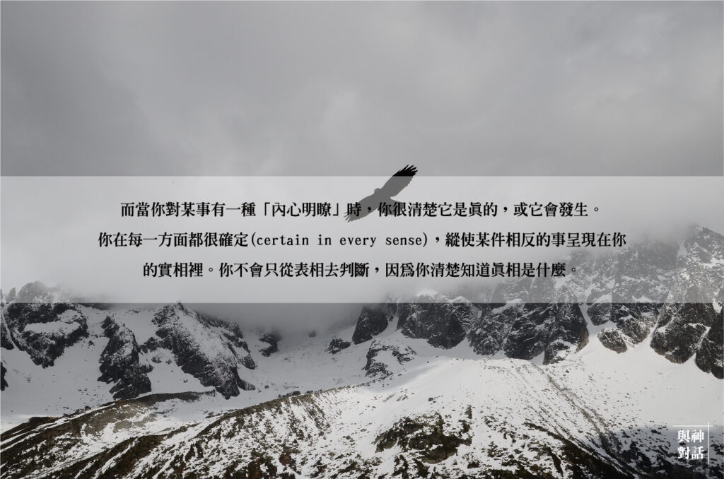而當你對某事有一種「內心明瞭」時,你很清楚它是真的,或它會發生。你在每一方面(感官辨識、意義、道理)都確定(certain in every sense),縱使某件相反的事呈現在你的實相裡。你不會只從表相去判斷,因為你清楚知道真相是什麼。