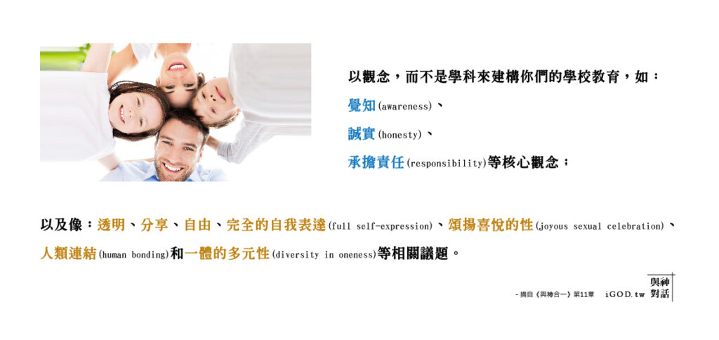 以觀念,而不是以學科(concepts, not academic subjects)來建構你們的學校教育,如:覺知(awareness)、誠實(honesty)、責任(responsibility)等核心觀念;以及像:透明、分享、自由、完全的自我表達(full self-expression)、頌揚喜悅的性(joyous sexual celebration)、人類連結(human bonding)和一體的多元性(diversity in oneness)等相關議題。