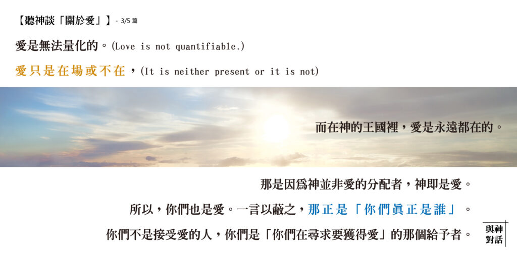 愛只是在場或不在 (It is neither present or it is not),而在神的王國裡,愛是永遠都在的。那是因為神並非愛的分配者,神即是愛。