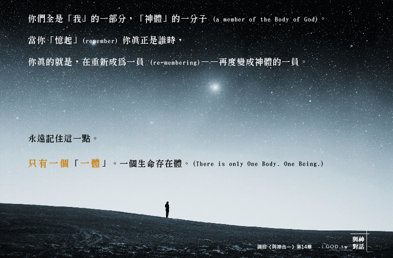 因為你們全是「我」的一部分,「神體」的一分子 (a member of the Body of God)。而當你「憶起」(remember) 你真正是誰時,你真的就是照著字面這樣去做。就是說,你在重新成為一員 (re-membering) ——再度變成神體的一員。