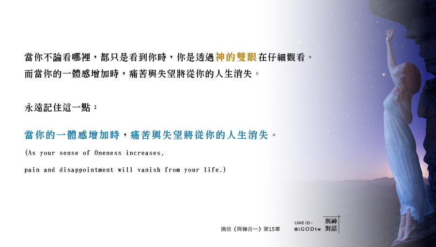 當你的一體感增加時,痛苦與失望將從你的人生消失。(As your sense of Oneness increases, pain and disappointment will vanish from your life.)