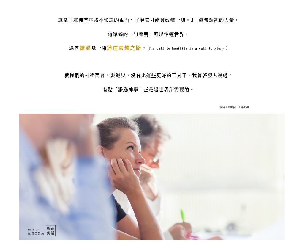 就你們的神學而言,要進步,沒有比這些更好的工具了。我曾啟發人說過:有點「謙遜神學」正是這世界所需要的。少一點「你全都知道」的把握,多一點意願去繼續追尋、去承認:也許有些你不知道的——知道它可能會改變一切。
