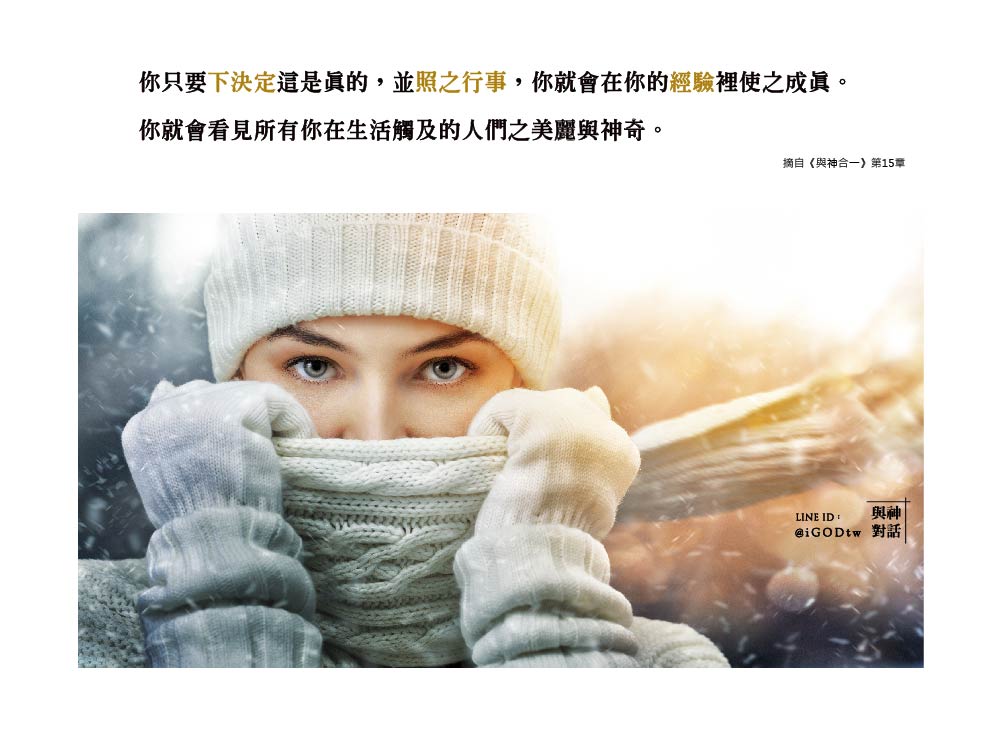 你只要下決定這是真的,並照之行事,你就會在你的經驗裡使之成真。你就會看見所有你在生活觸及的人們之美麗與神奇。因為你們每個的確都是神奇的,但沒有一個人比另一個人更神奇。而有一天,你們全都會溶為一體,共同形成一股單一的洪流。
