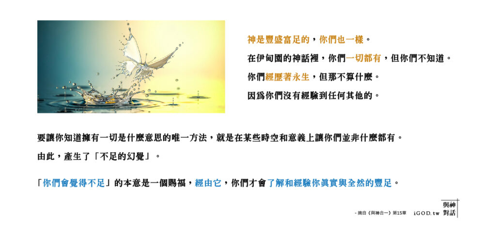 神是豐盛富足的,你們也一樣。在伊甸園的神話裡,你們一切都有,但你們不知道。你們經歷著永生,但那不算什麼。因為你們沒有經驗到任何其他的。