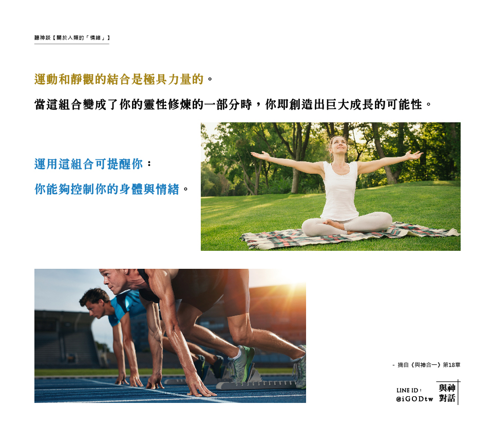運動和靜觀的結合是極具力量的。當這組合變成了你的靈性修煉的一部分時,你即創造出巨大成長的可能性。