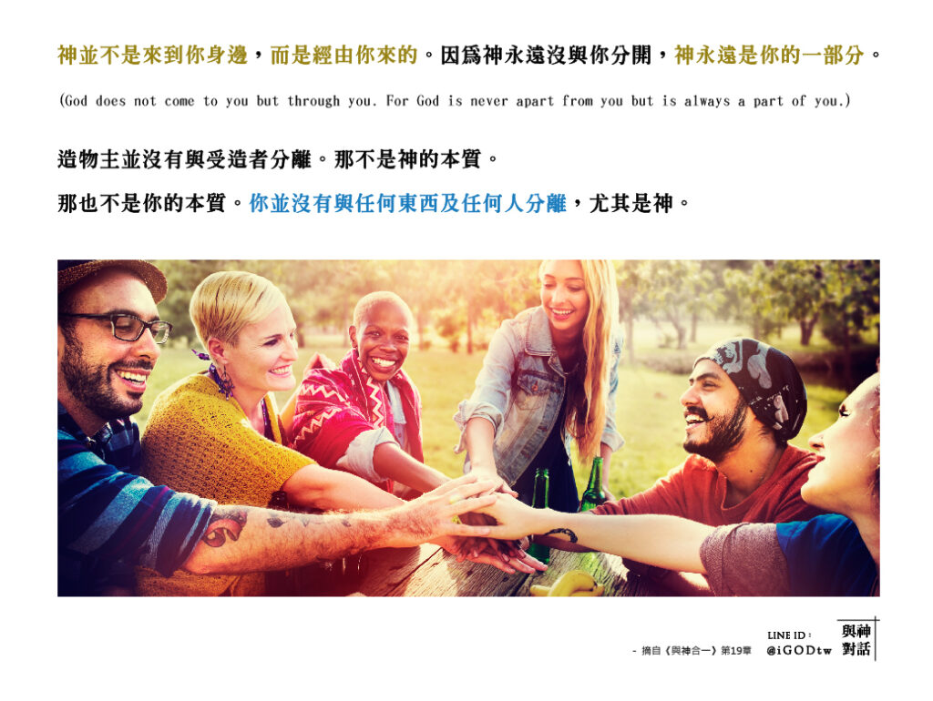 那是神的愛將神帶給你。是你「對自己的愛」帶來了「對自己是神」的那部分的覺知——因此你知道:神並不是來到你身邊,而是經由你來的。因為神永遠沒與你分開,神永遠是你的一部分。 (God does not come to you but through you. For God is never apart from you but is always a part of you.)