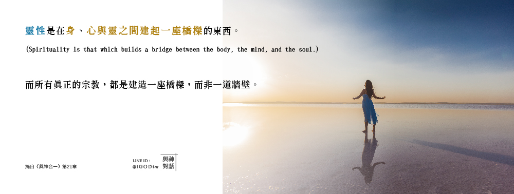 並且,別以為宗教與靈性並不是同一樣東西。靈性是在身、心與靈之間建起一座橋樑的東西 (Spirituality is that which builds a bridge between the body, the mind, and the soul.)。而所有真正的宗教,都是建造一座橋樑,而非一道牆壁。