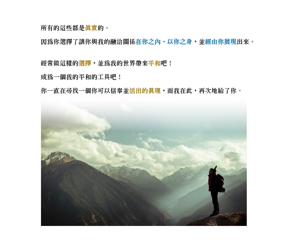 所有的這些都是真實的,因為你選擇了讓你與我的融洽關係在你之內、以你之身,並經由你展現出來。經常做這樣的選擇,並為我的世界帶來平和吧!