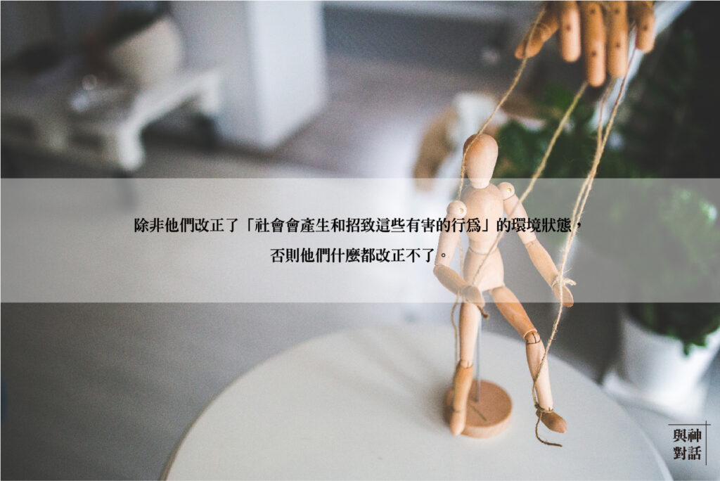 人們以為「懲罰就能改正」這些行為。有些人仍然不明瞭:除非他們改正了「社會會產生和招致這些有害的行為」的環境狀態,否則他們什麼都改正不了。