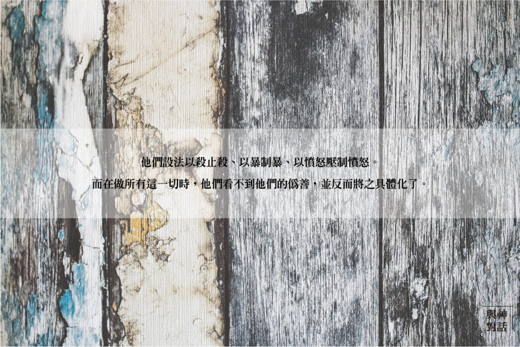一個真正客觀的分析會證明這一點,然而許多人都不願正視這個證據,而繼續試圖「以創造社會問題的同樣能量在解決問題」。他們設法以殺止殺、以暴制暴、以憤怒壓制憤怒。而在做所有這一切時,他們看不到他們的偽善,並反而將之具體化了。