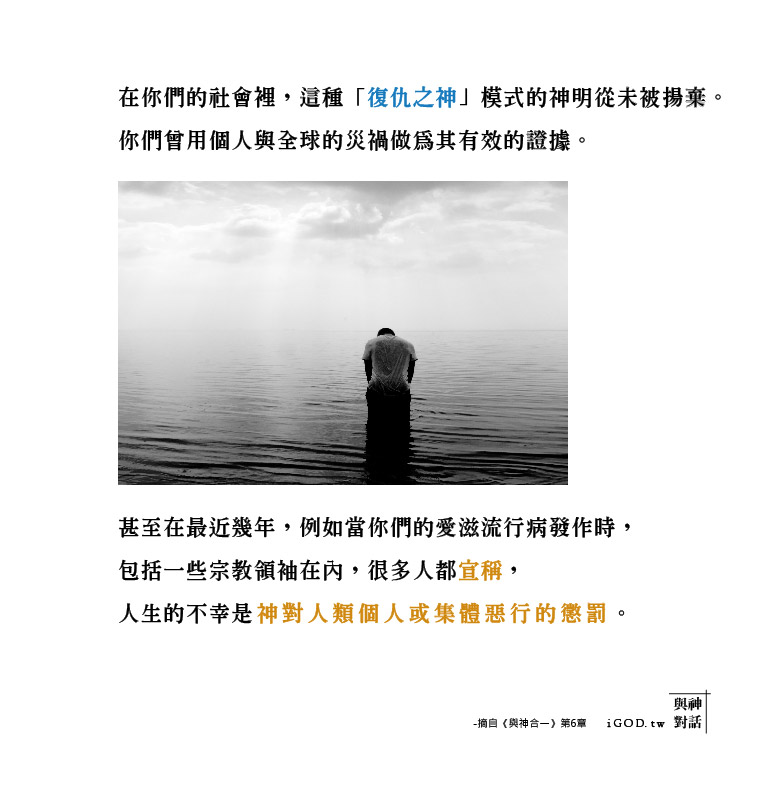 在你們的社會裡,這種「復仇之神」模式的神明從未被揚棄。你們曾用個人與全球的災禍做為其有效的證據。甚至在最近幾年,例如當你們的愛滋流行病發作時,包括一些宗教領袖在內,很多人都宣稱,人生的不幸是神對人類個人或集體惡行的懲罰。