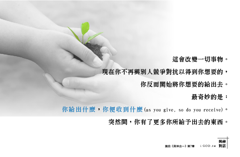 這會改變一切事物。現在你不再與別人競爭對抗以得到你想要的,你反而開始將你想要的給出去。不再為獲得更多愛爭鬥,你反而開始給出更多的愛。不再為想獲得成功而鬥爭,你反而開始確保每個人都是成功的。不再抓權,你反而開始賦予別人權力。