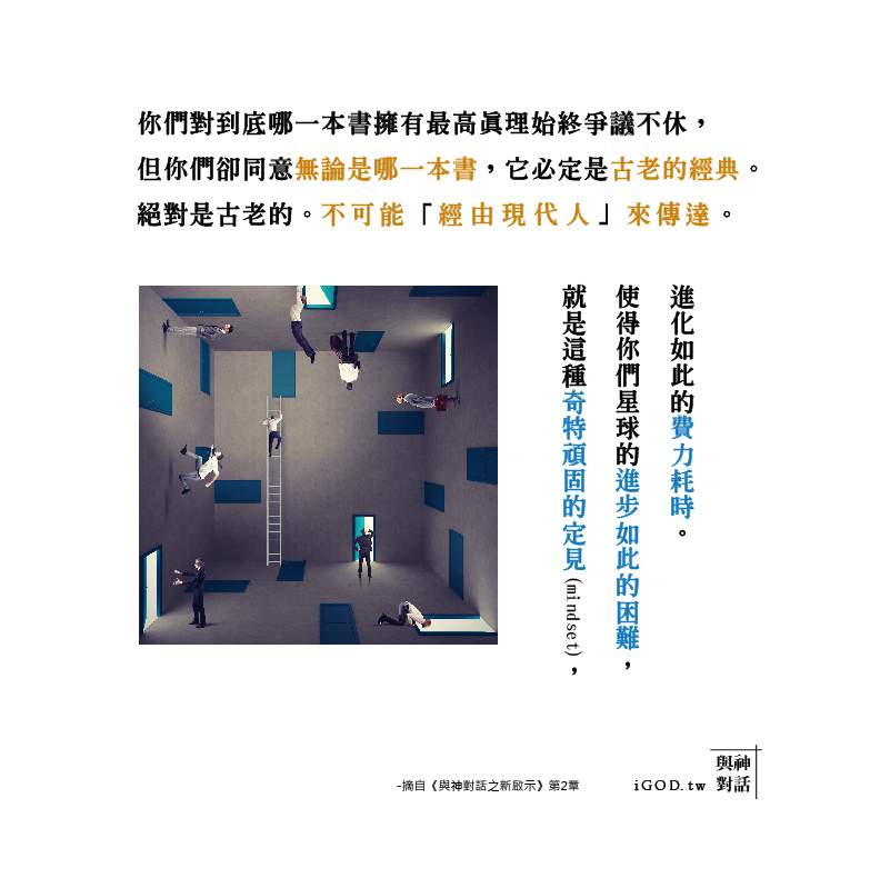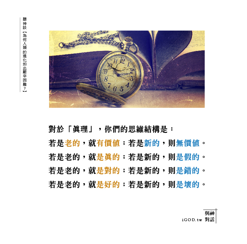 神的觀察明確指出:人類無法以西元一世紀的指導方針,來解決二十一世紀的困境。但多數人依然相信並堅持「只能以古代流傳下來的經典為依據」。