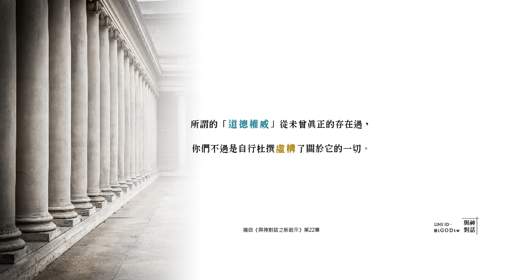 在你們自己的人生當中,藉由將「道德價值」(“moral value”)從你們的選擇中移除,你們也就移除了「道德權威」(“moral authority”)(反正, 所謂的「道德權威」從未曾真正的存在過 ,你們不過是自行杜撰虛構了關於它的一切)。