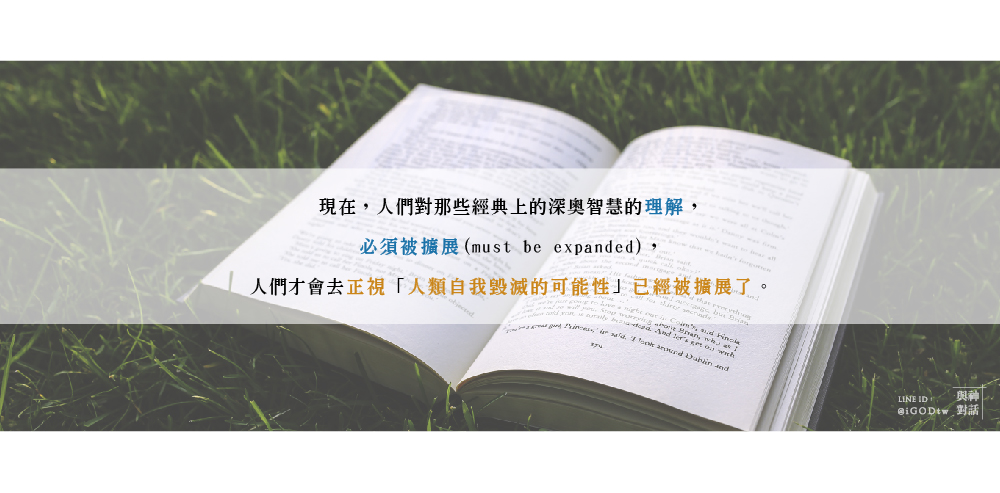 人類各經典上的深奧智慧曾經幫助世界免於走入災難,而且它還能再次幫助人類做到。但是,那些智慧現在必須被擴展 (must be expanded),人們才會去正視「人類自我毀滅的可能性已經被擴展了」。