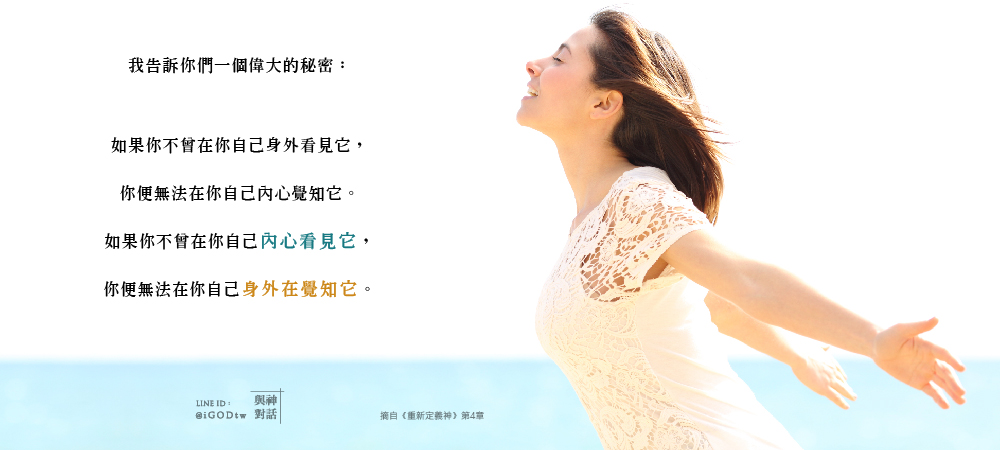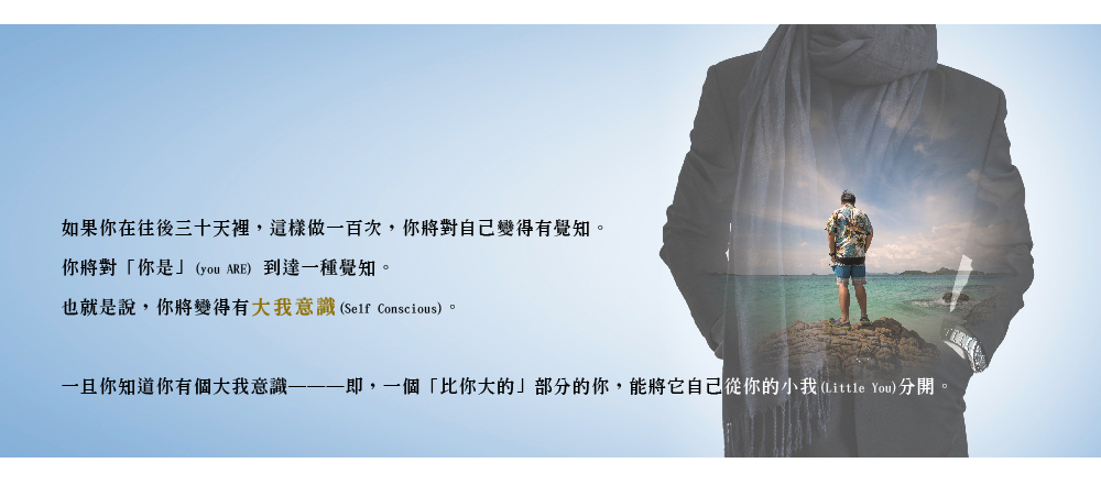 如果你在往後三十天裡,這樣做一百次,你將對自己變得有覺知。你也許不會對「你是誰」有個充分的理解,但你將對「你是」(you ARE)到達一種覺知。也就是說,你將變得有大我意識(Self Conscious)。