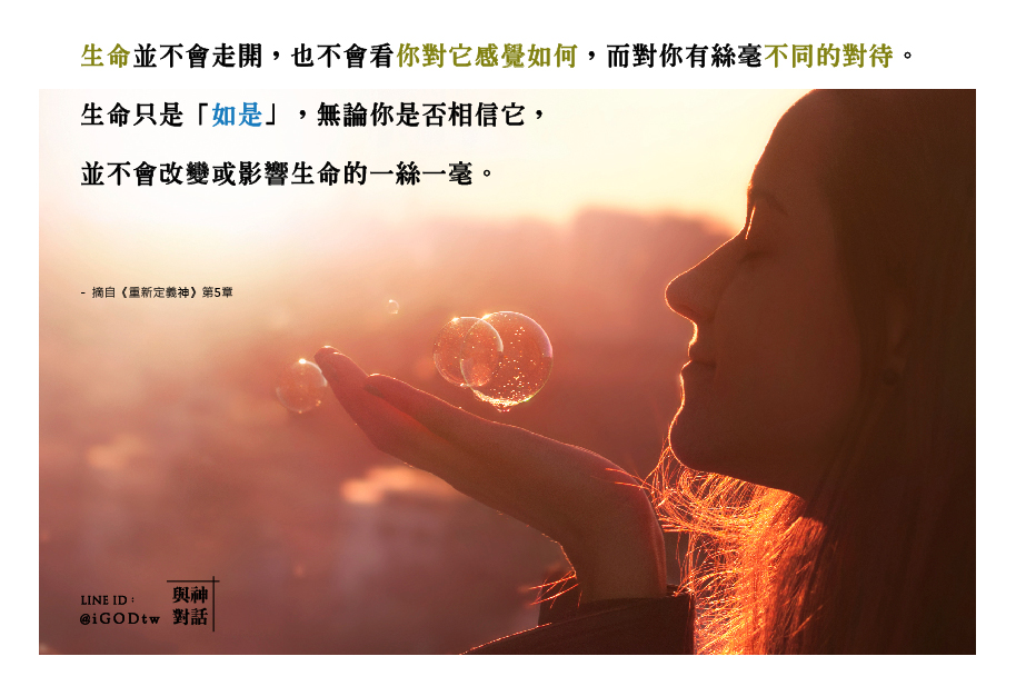 你可能不相信神(God),不相信有「神」這回事。然而,你必定相信有「生命」這回事,因為你就是生命(Life),並且無時無刻都身在其中經歷著 Life——生命、人生、生活。