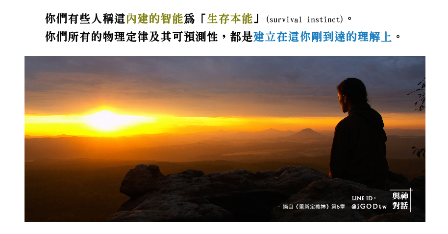 你們有些人稱這內建的智能為「生存本能」(survival instinct)。你們所有的物理定律,及其可預測性,都是建立在這你剛到達的理解上。
