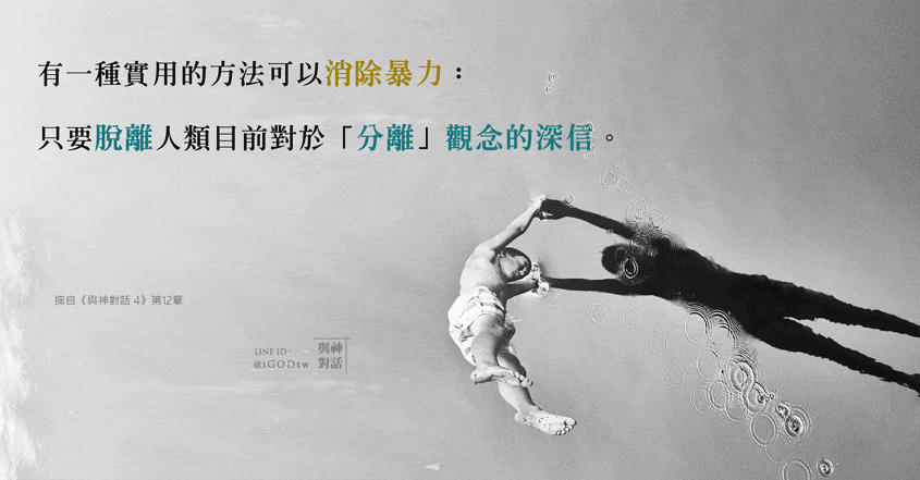 有一種實用的方法可以消除暴力:只要脫離人類目前對於「分離」觀念的深信(move away from humanity’s present deep belief in Separation)。
