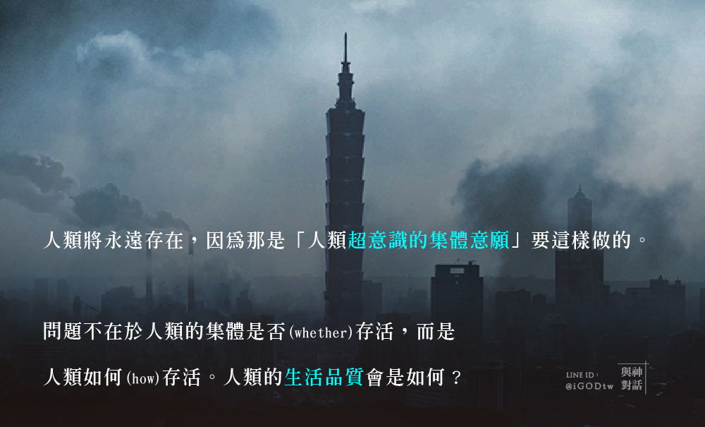 就一個集體而言,人類無法也不會受到威脅。人類將永遠存在,因為那是「人類超意識的集體意願」要這樣做的。問題不在於稱為「人類」的集體是否(whether)存活,而是如何(how)存活。(也就是說)人類的生活品質會是如何?